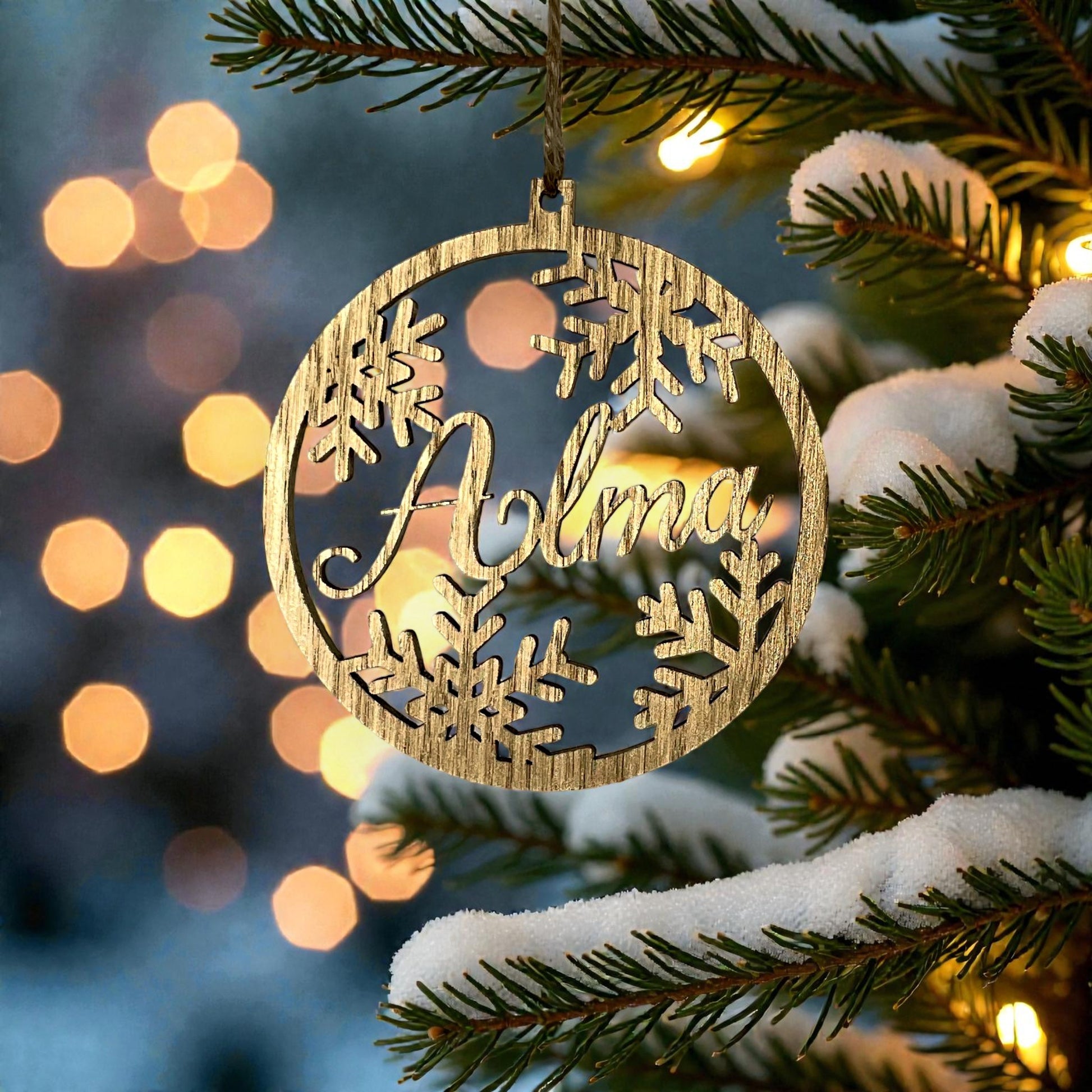 Julpynt i ek har en annan tyngd än tunnare material. Ådringen varierar och gör varje julgransdekoration med namn unik. Metallic-färgerna – guld, silver och koppar – ligger tydligt mot träets yta och fångar ljuset från granens belysning.
