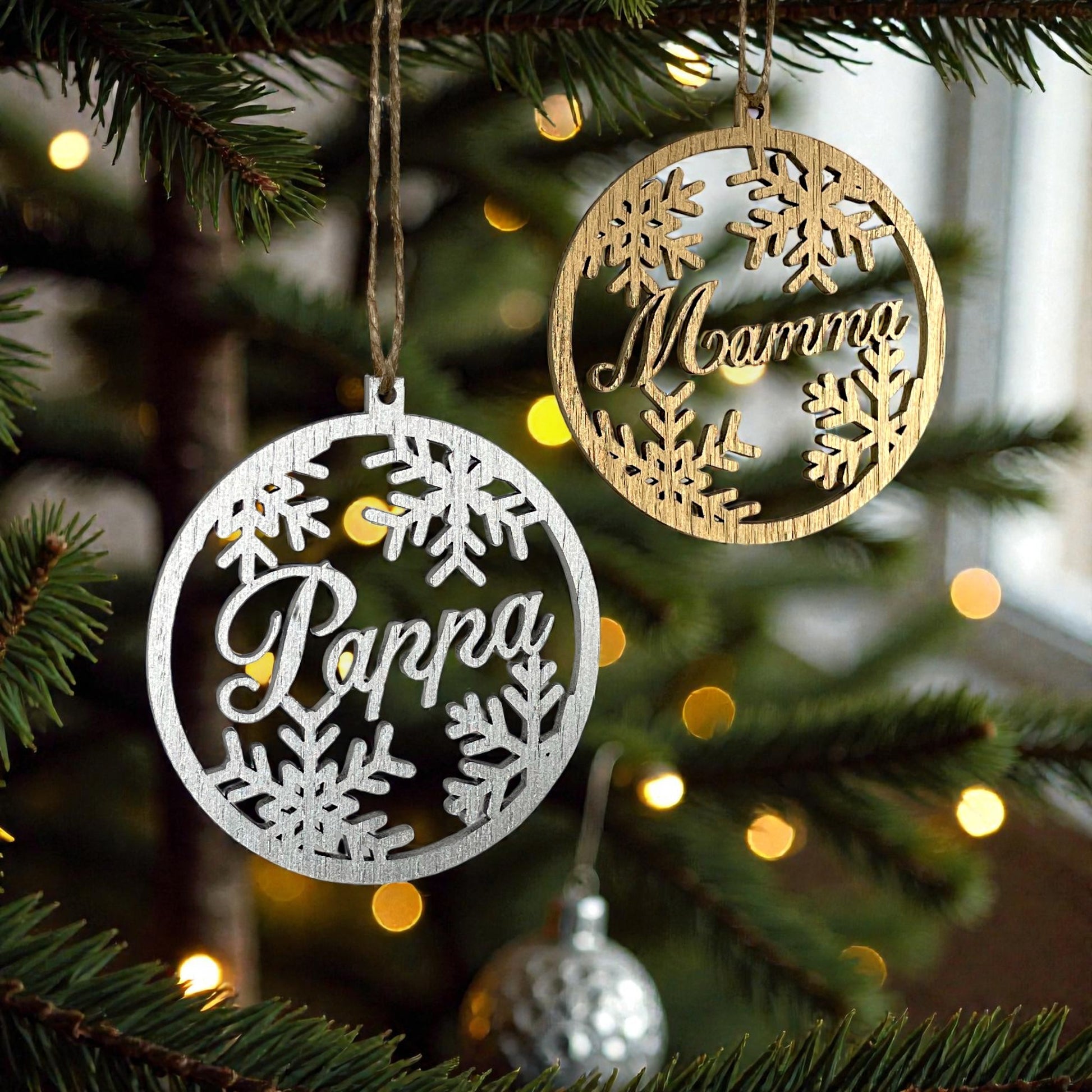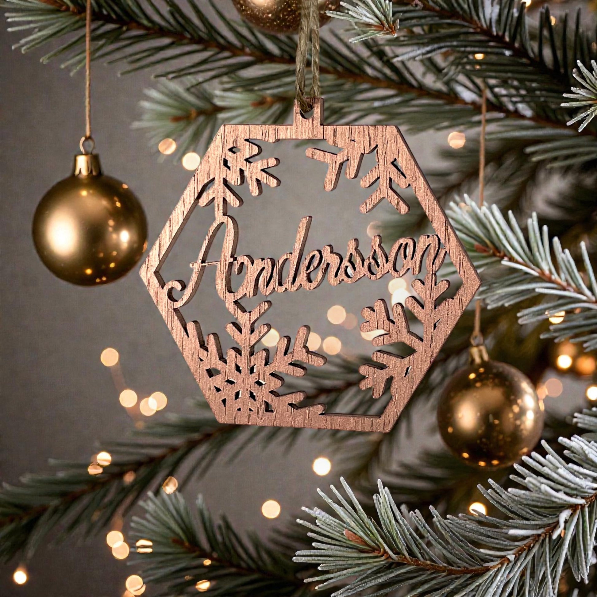 Med tiden blir det en del av hur julen ser ut i just det hemmet. I granen står det bland ljus och kulor. Formen – rund eller hexagon – ger två tydliga uttryck, men funktionen är densamma: ett namn som hör hemma där.