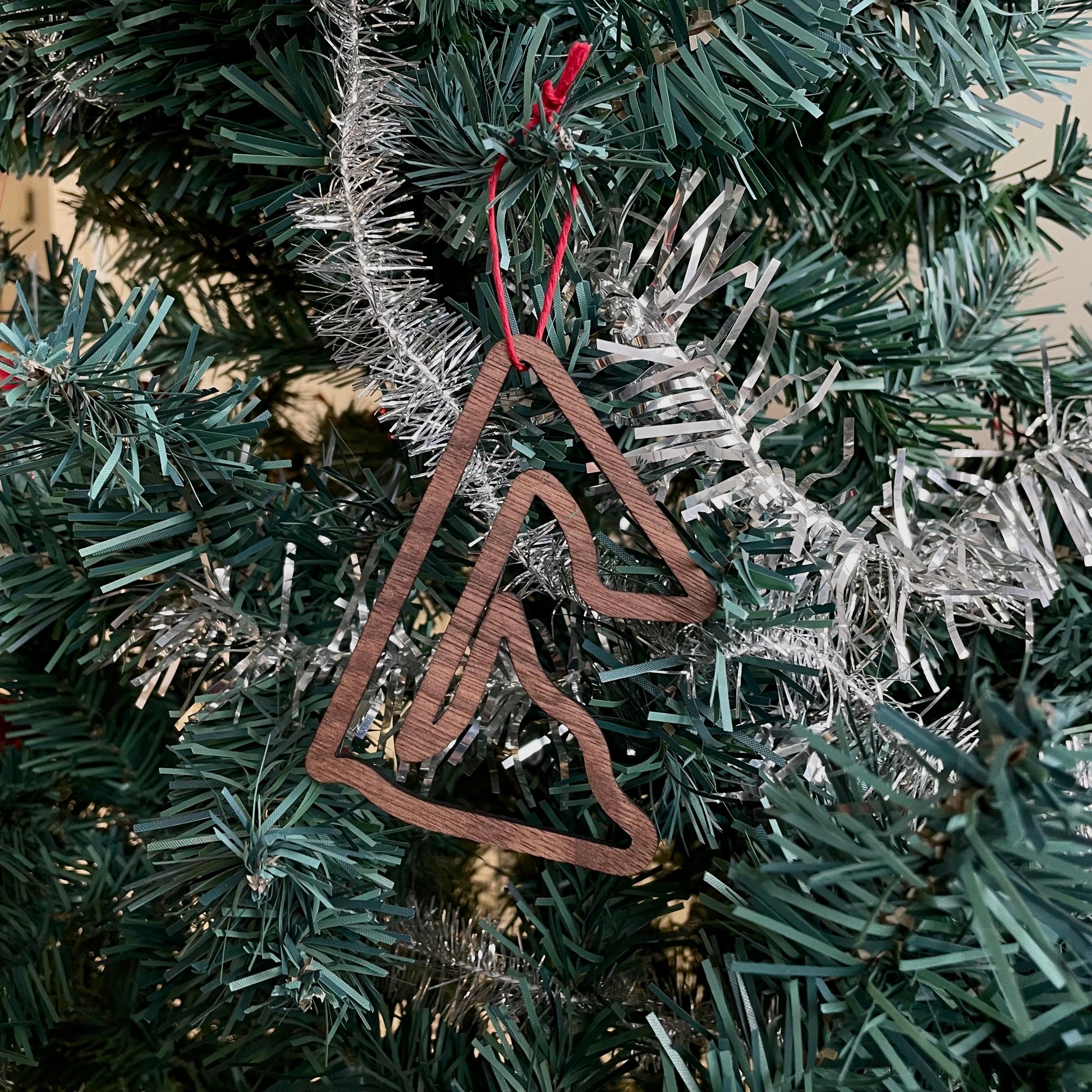 Varje hänge är utskuret i 4 mm FSC-certifierad valnöt och mäter cirka 10 cm på längsta sidan. Träets mörkare ton ger en tydlig silhuett mot granens gröna. Ådringen varierar från exemplar till exemplar.