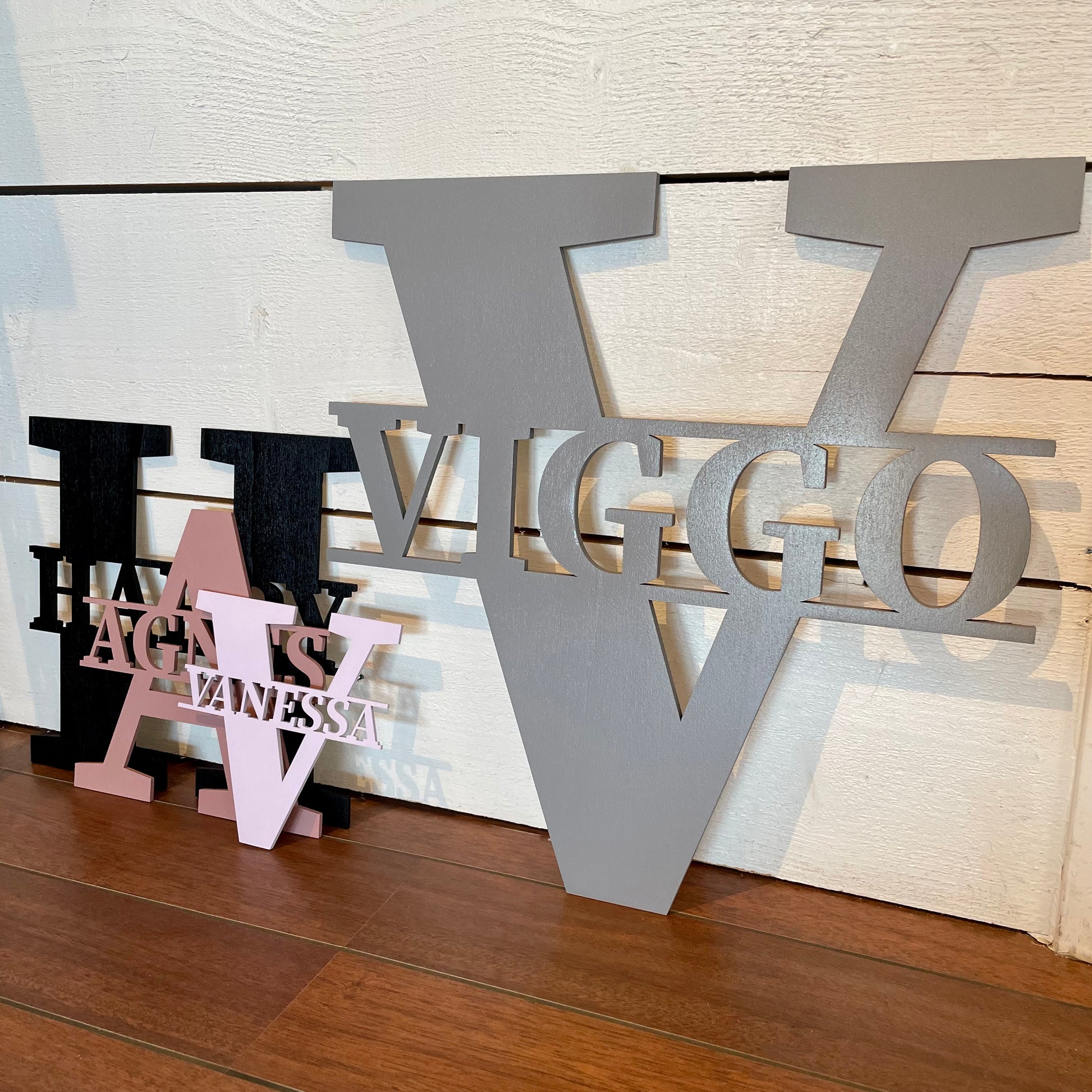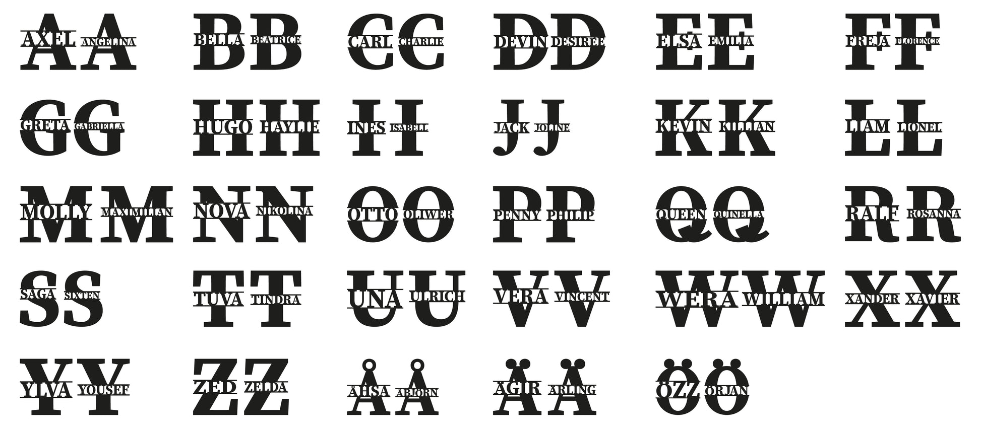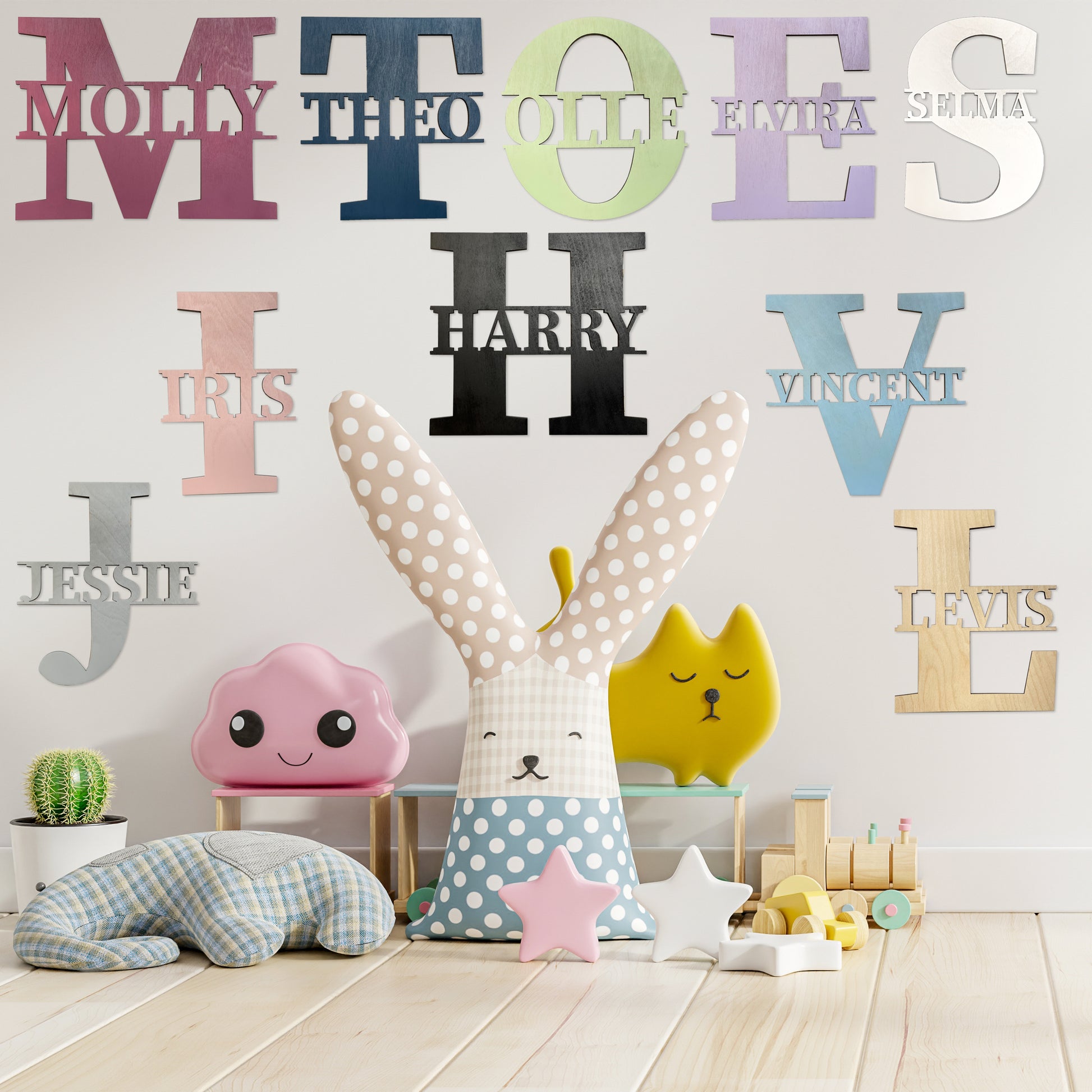 Varje väggbokstav tillverkas med det valda namnet integrerat i bokstavens form, vilket ger ett rent och balanserat uttryck som håller över tid.